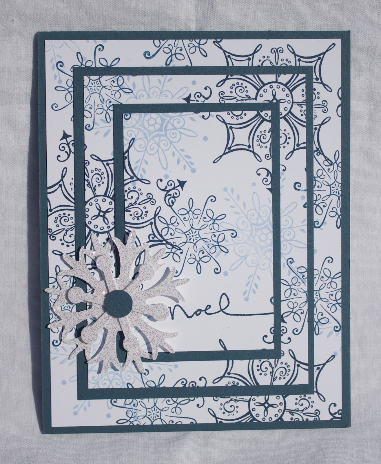 here. It uses a set I love called Serene Snowflakes. I used my Scoring Board to score all the lines along all four sides. That was the most consuming part.